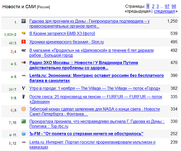 На счетчике LiveInternet сделали любопытный новый вид отчета - переходы из социальных сетей на статьи в СМИ. То есть можно посмотреть, какая именно новость в настоящий момент вызывает наибольший интерес в социальных сетях. Понятно, что охватываются не все сети, но результат тем не менее любопытный. Вот, на данный момент.