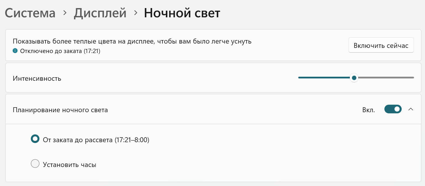У Windows 11, разумеется, этот режим есть, и его можно просто включать, включать по расписанию или сделать так, чтобы он автоматически устанавливался от заката до рассвета.