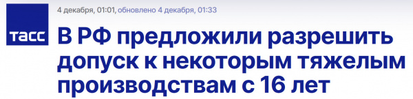 МОСКВА, 4 декабря. /ТАСС/. Минпромторг России предлагает внести изменения в постановление правительства с перечнем тяжелых работ и работ с вредными или опасными условиями труда, на которых запрещается применение труда несовершеннолетних, разрешив допуск к некоторым таким производствам лицам с 16 лет. Об этом говорится в списке ответов ведомства депутатам Госдумы РФ на вопросы к правчасу по теме повышения роли системы среднего профессионального образования в кадровом обеспечении отраслей производства. Документ есть в распоряжении ТАСС. (Отсюда.)