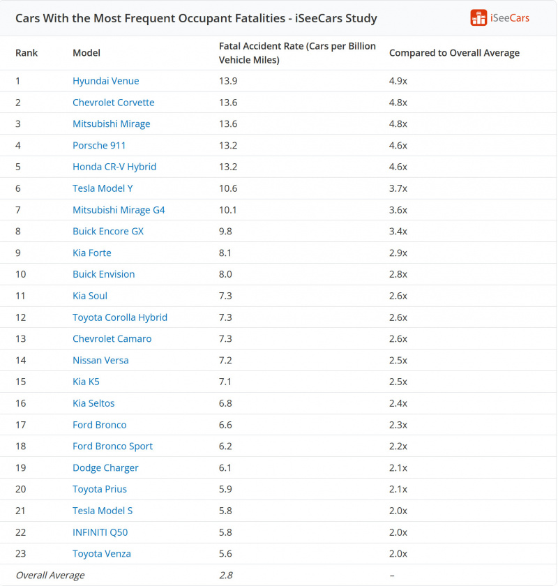 В пятерку самых опасных автомобилей входят Hyundai Venue, Chevrolet Corvette, Mitsubishi Mirage, Porsche 911 и Honda CR-V Hybrid, причем количество ДТП со смертельным исходом почти в пять раз выше, чем у среднестатистического автомобиля.