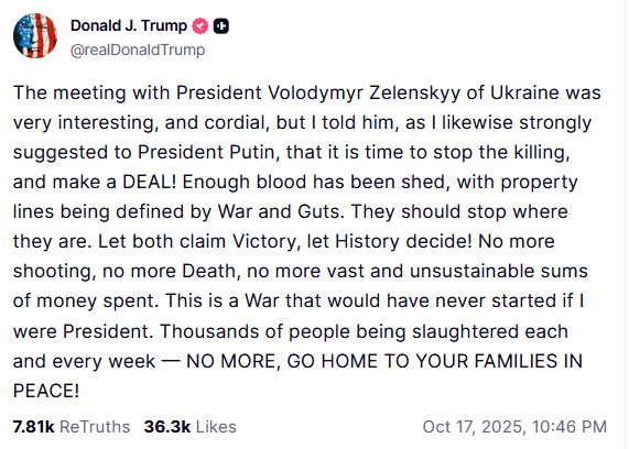 Встреча с президентом Украины Владимиром Зеленским была очень интересной и сердечной, но я сказал ему, как и президенту Путину, что пора прекратить убийства и заключить СОГЛАШЕНИЕ! Достаточно крови пролито, а границы владений определены войной и мужеством. Они должны остановиться на достигнутом. Пусть оба объявят о победе, пусть история решает! Хватит стрелять, хватит убивать, хватит тратить огромные и непомерные суммы денег. Эта война никогда бы не началась, если бы я был президентом. Тысячи людей гибнут каждую неделю — ХВАТИТ, ВЕРНИТЕСЬ ДОМА К СВОИМ СЕМЬЯМ В МИРЕ!