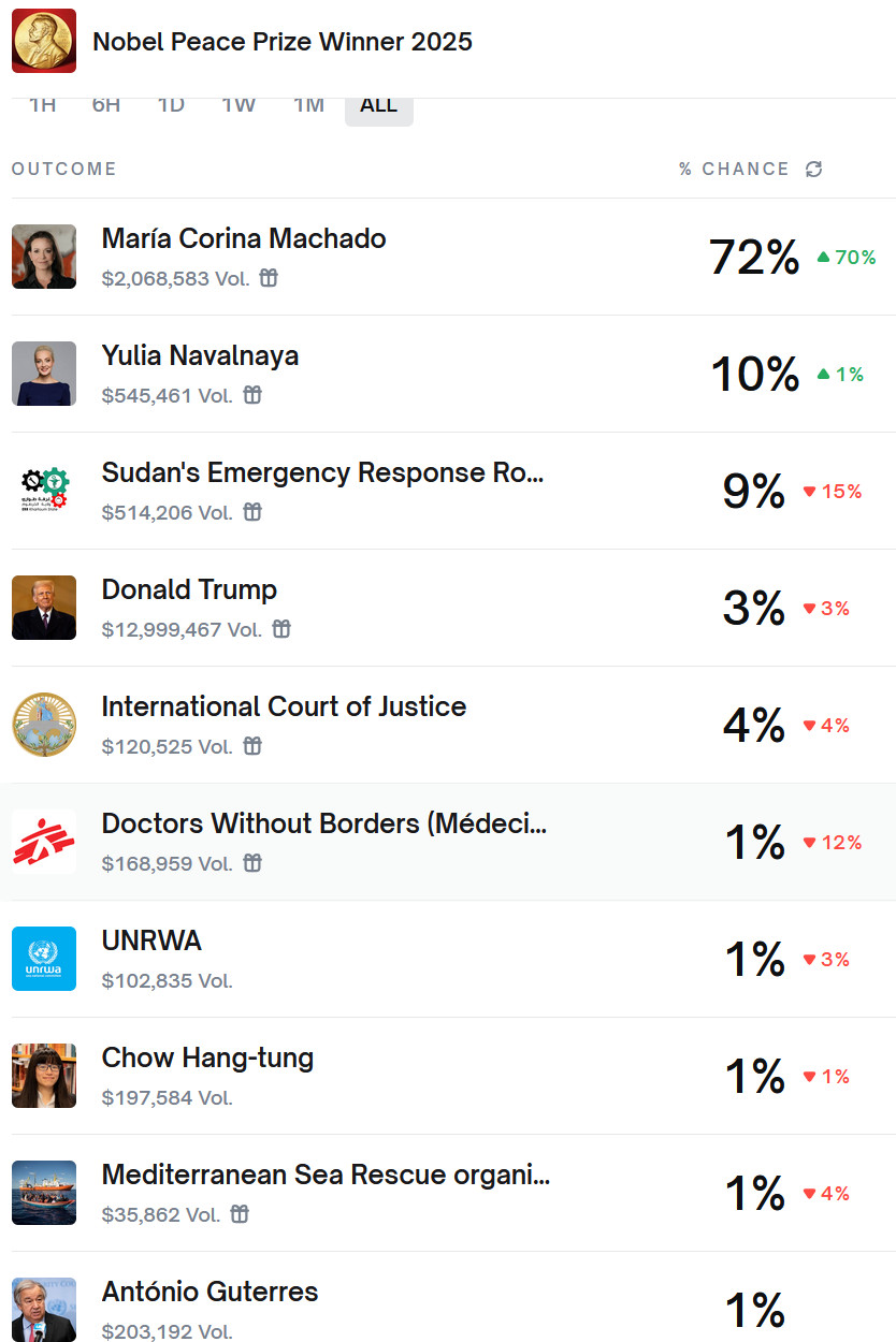 Вероятности получения Нобелевской премии мира по версии букмекерского агентства Polymarket.