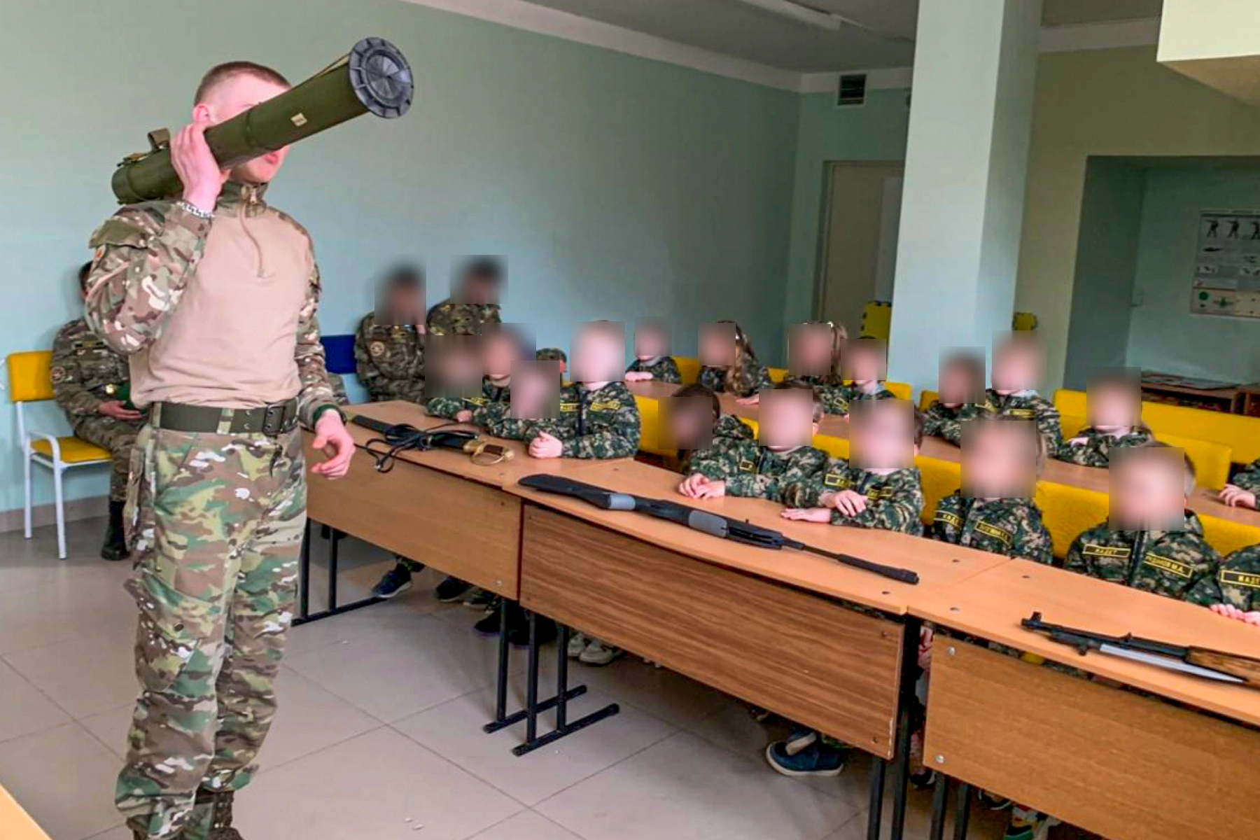 🔵 Дети 4-7 лет участвуют в конкурсах строя и песни, оттачивают «правильность маршировки в колонне и четкость в сдаче рапорта», занимаются рукопашным боем и огневой подготовке, посещают городские мероприятия в парадной форме, плетут маскировочные сети и встречаются с российскими военными.