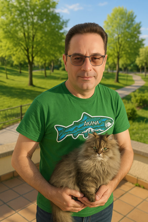 Для начала загрузил свое фото, фото кошки и попросил, как в рекламном ролике, посадить кошку мне на руки и поместить нас в какое-нибудь хорошо освещенное место на улице.
