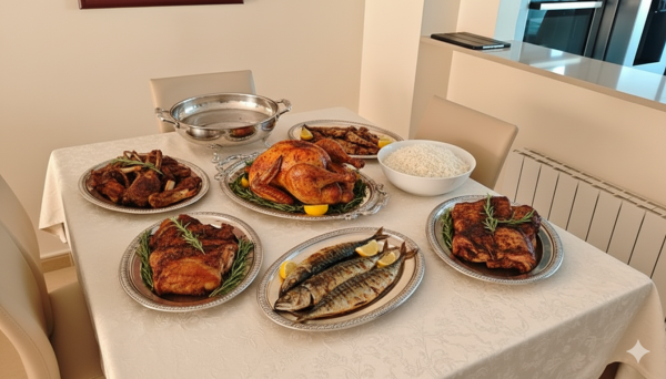 Накрой этот стол скатертью и поставь на стол несколько подносов с различными готовыми блюдами - индейкой, скумбрией, рисом, бараниной и свининой.