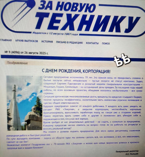 Гендиректор РКК «Энергия» Игорь Мальцев в обращении к сотрудникам по случаю 79-летия предприятия сообщил о критической ситуации, в которой оказалась компания, предрекая ее вероятное закрытие. Скриншот обращения, опубликованного на внутреннем сайте корпорации нашла "Газета ру".