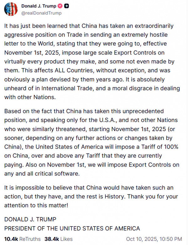 Исходя из того, что Китай занял эту беспрецедентную позицию, и выступая только от имени США, а не других стран, которые подверглись аналогичной угрозе, с 1 ноября 2025 года (или раньше, в зависимости от дальнейших действий или изменений со стороны Китая) Соединенные Штаты Америки введут пошлину в размере 100% на Китай, сверх любой пошлины, которую они платят в настоящее время. Также 1 ноября мы введем экспортный контроль на все критически важное программное обеспечение.