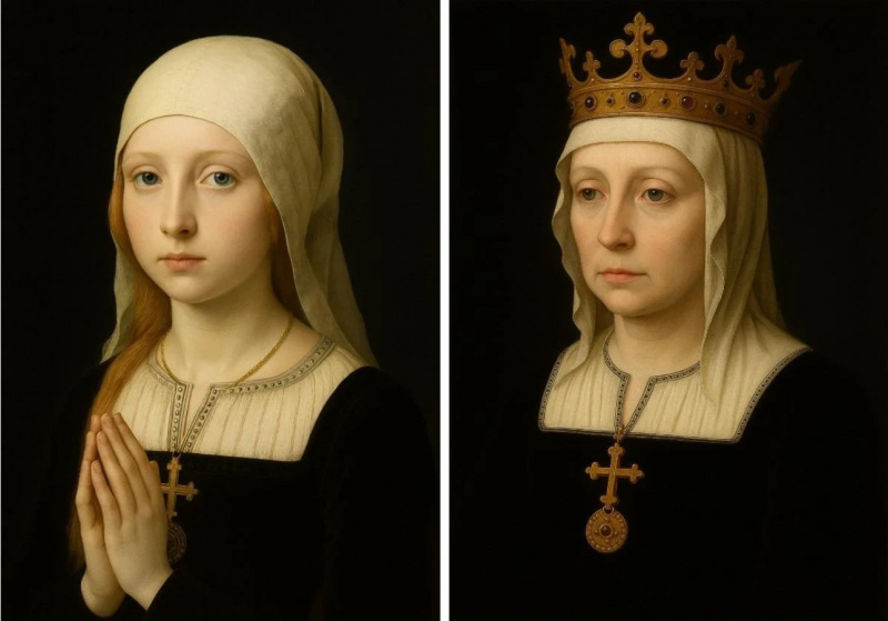 Хосе Луис Рубио, директор Комиссии о беатификации (признания блаженной - это шаг на пути к канонизации) Исабель Кастильской, вместе со специалистами по физиогномике и с привлечением ИИ воссоздали лицо королевы, причем Рубио утверждает, что вероятность совпадения с реальной личностью - более 90%.