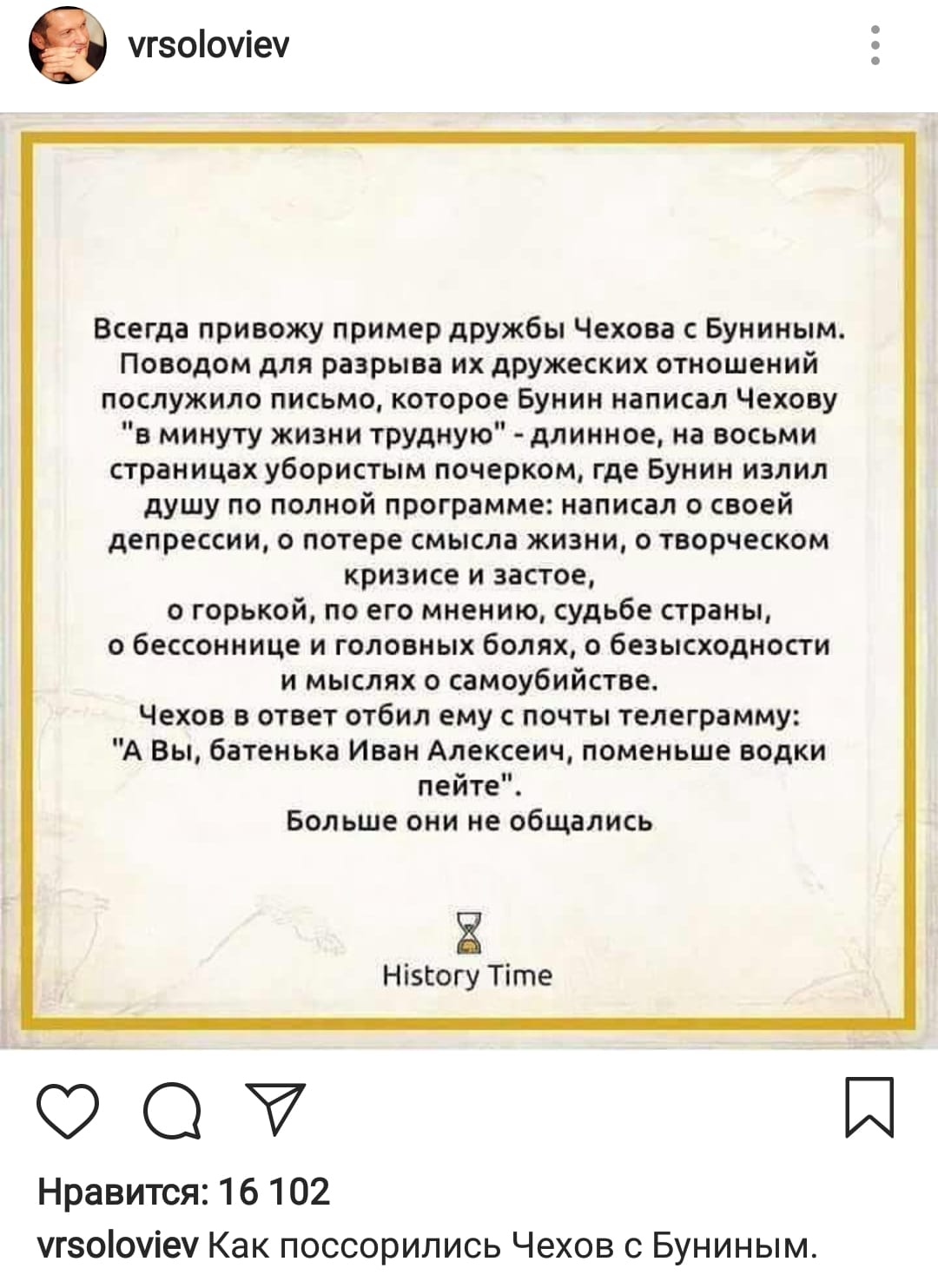 Вот и Вова всегда приводит пример дружбы Чехова с Буниным. На самом же деле Бунин в своих воспоминаниях о Чехове описывал случай, как Чехов похожим образом ответил телеграммой некоему безвестному почитателю, который его изрядно достал. А вот перевернуть это с ног на голову и придумать, что Чехов такое мог ответить самому Бунину - как видно, тоже не проблема.