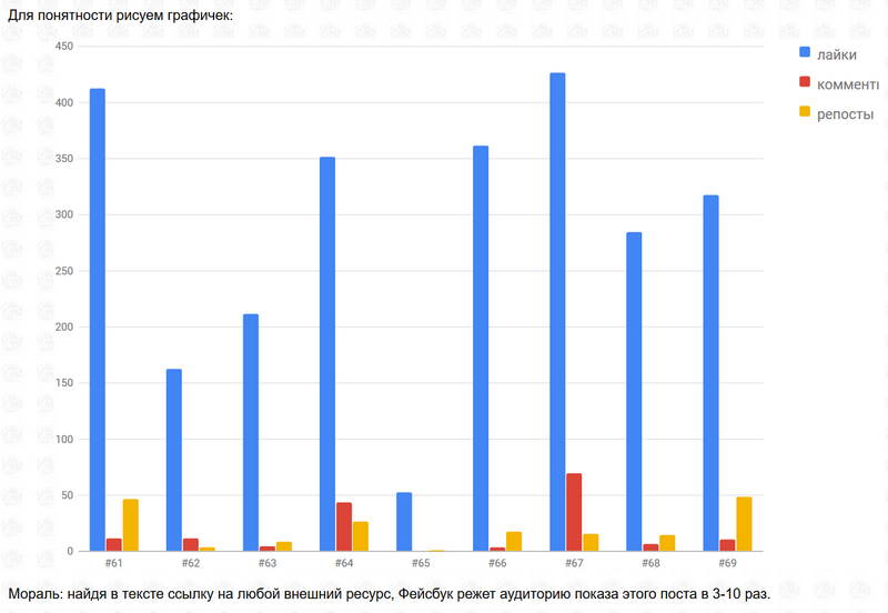 Так вот. Во-первых, должен на это заметить, что, благодаря чудесным ветвистым и кривеньким ручонкам программистов господина Закерберга, ЛЮБОЙ ваш пост будет показан очень небольшому количеству ваших подписчиков и френдов, потому что алгоритм показа постов строится по древней каббалистической формуле קבלו זין ולא פוסט, которую с иврита можно перевести приблизительно как "Х#ЙВАМАНЕПОСТ". То есть ставите вы там ссылку или не ставите - это абсолютно эквипенисуально, все равно его мало кто увидит (проведенные эксперименты давали цифры от 10 до 25 процентов подписчиков, то есть даже не половину). Во-вторых, я еще раз провел экслеримент на своих 25 тысячах (это я прихвастнул, на самом деле там всего-то 24764) подписчиков и целый день давал ссылки на статьи и посты в блоге на Exler.ru не в теле поста, как обычно, а в первом комменте.