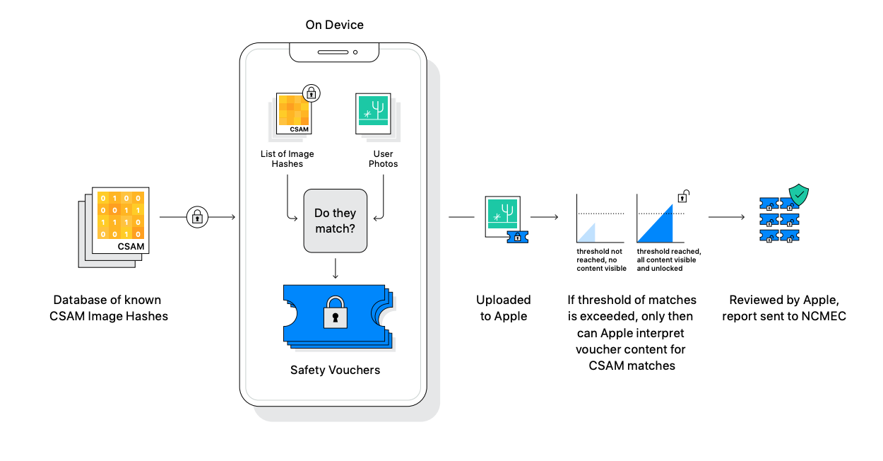 Apple’s method of detecting known CSAM is designed with user privacy in mind. Instead of scanning images in the cloud, the system performs on-device matching using a database of known CSAM image hashes provided by NCMEC and other child safety organizations.