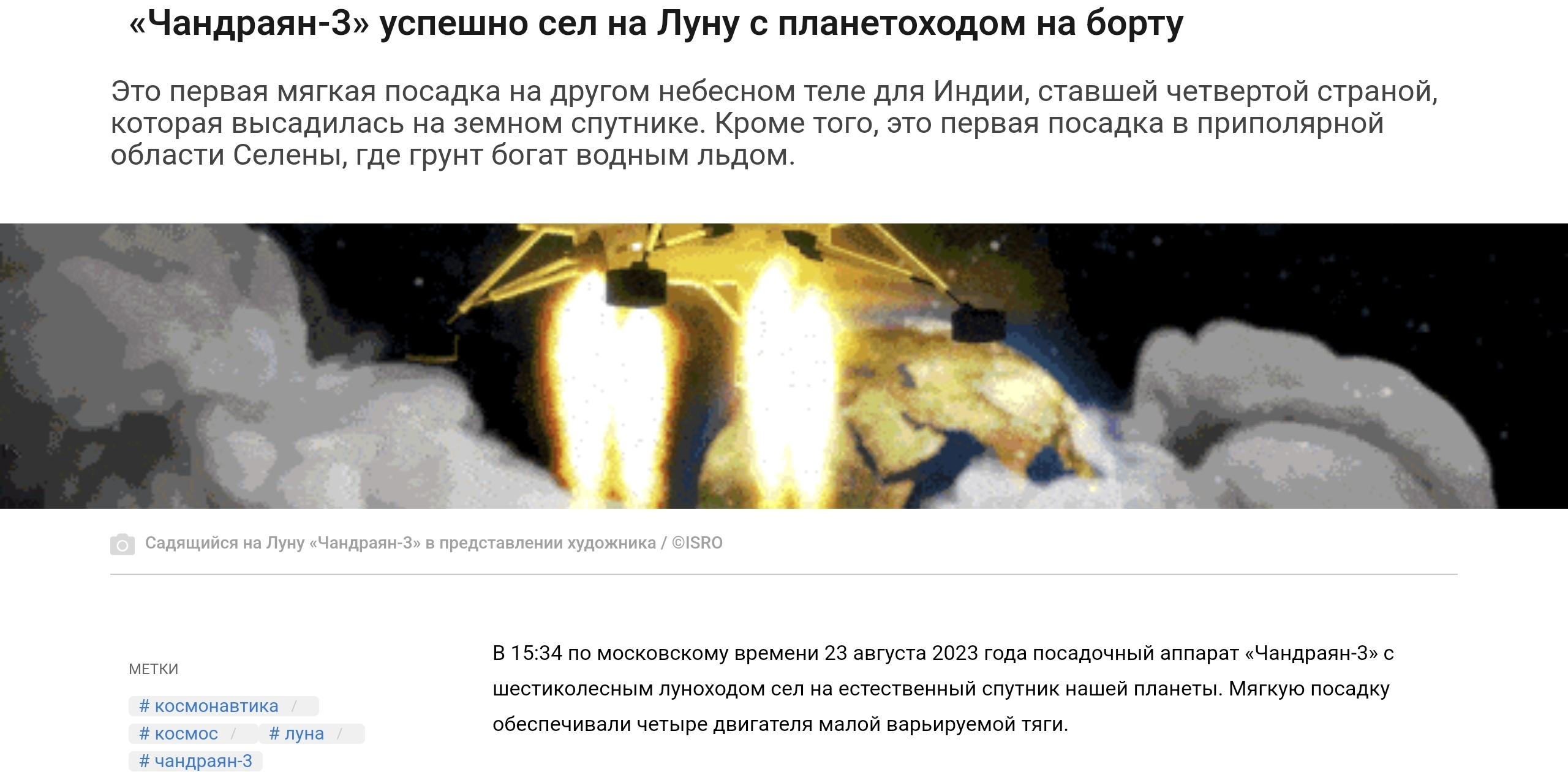 Первое упоминание индийских успехов в космосе помню в первой книге Стругацких «Страна багровых туч» 😉 Там ещё была история с переписыванием текста - командир звездолета КСР «Янцзы» Лу Ши-эр превратился в командира индийского звездолета «Карма» Рая Листа.