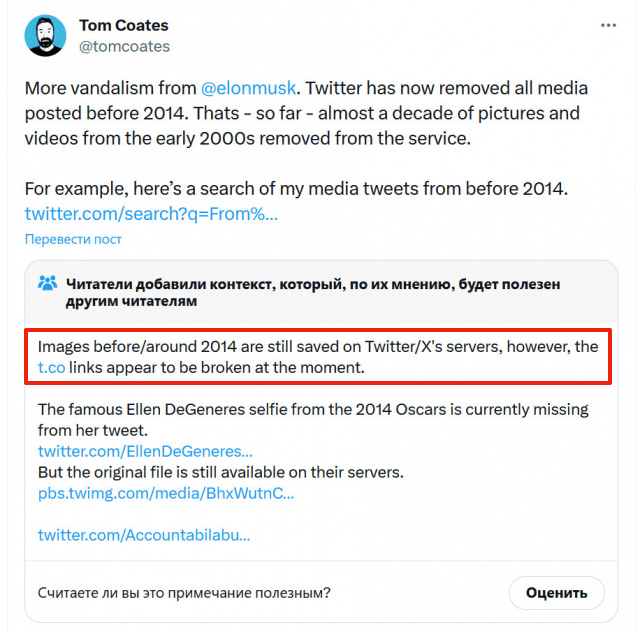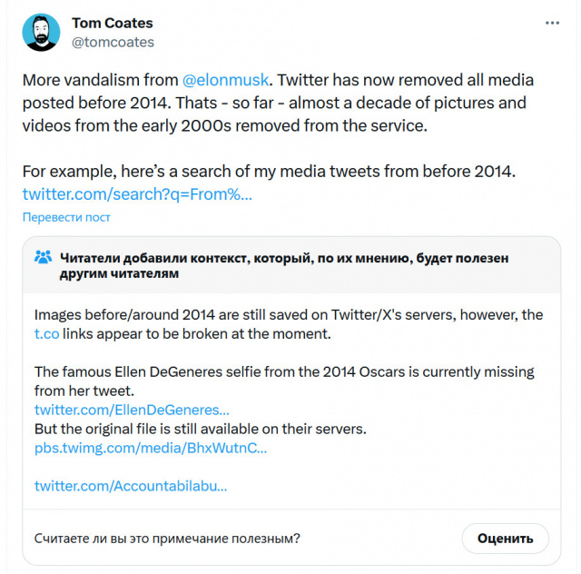 Вторая - в X-сети пропали все записи, сделанные до 2014 года. Об этом пишут несколько экспертов - в частности, Tom Coates.