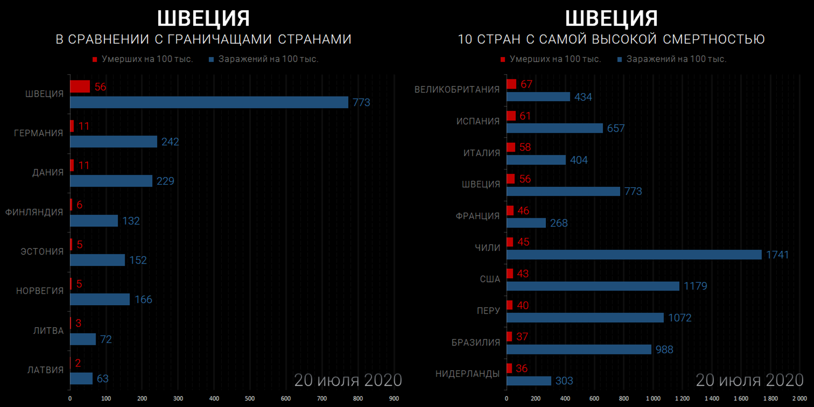 Тоже множество мигрантов, тоже были свои косяки. Но при этом в относительных значениях (на 100 тысяч населения) – потери в 5 раз ниже шведских (у других соседей и того меньше)...