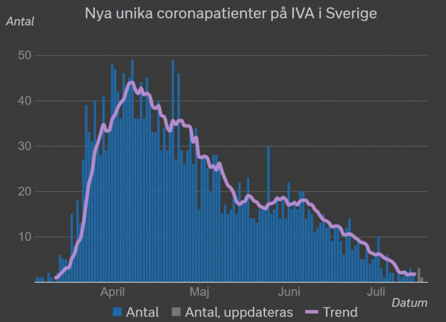 Один из самых важных индикаторов - количество пациентов в интенсивной терапии. С апреля снижение на 89%. На топе было 558, сейчас - 62. Количество новых пациентов снизилось с почти 50 в день, до 2 в день, в среднем. В некоторые дни июля - ноль новых. В самый разгар пандемии количество доступных мест в интенсивной терапии было удвоено и доведено до почти 1100, сейчас практически все дополнительные места сокращены и общее количество доступных мест - 570.