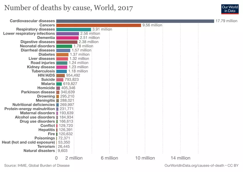 А от рака в этой же стране помирает 600 000 ежегодно. Болезни сердца уносят ежегодно 635 000. Несчастные случаи и самоубийства - 200 000.