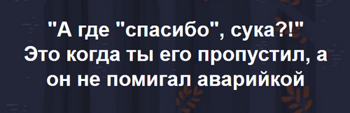 Не люблю спасибкать аварийками - лишнее отвлечение от дороги, итак внимания нужно максимум. И от других не требую: пропустили - хорошо, пропустил я - мне не жалко, если только в наглую не лезут. Это само собой разумеющееся на дороге и совершенно необязательное, правилами не прописанное. Больше бесит, когда нагло влезают, а потом аварийкой спасибкают. Да пошёл ты, мудило оборзевший! Вообще, излишняя вежливость на дороге мне нафиг не упала. Например, бывает, что мне нужно повернуть налево через двухполосную встречку, на ближнем ряду встречки кто-то останавливается, мигает фарами, мол, проезжай. Вот нафига мне эта вежливость упала, я ж не вижу первый ряд, остановится там машина или нет. Лишний напряг и возможность влететь в аварию из-за таких вежливых. Там же светофор где-то дальше, обязательно будет промежуток, я спокойно лучше дождусь. Короче, ездили бы все просто по правилам и не страдали бы фигнёй.