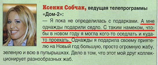 Хе. 😄 Ну если конечно это не "творчество" "желтой" прессы [могли ведь и ловко переврать слова], тогда Ксюха конечно подставилась. Не считаю ее дурой (хотя вообще-то мало что о ней знаю), но изредка доносимые слухи о личной умной и дальновидной продуманности и просчитанности поведения и имиджа можно смело считать сильно преувеличенными.