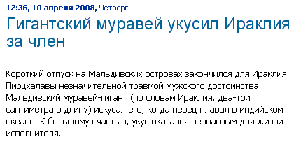 ...... Пишу из под стола. Это ж надо... Такой драматичный момент. Водоплавующий трехсантиметровый муравей(прям муравей-амфибия) медленно подплывает к Ираклию и резким броском кусает его за... Укус оказался неопасным для жизни певца, так как пришелся всего лишь в гениталии. Блин почитаешь нашу прессу и сценарий для фильма ужаса уже готов