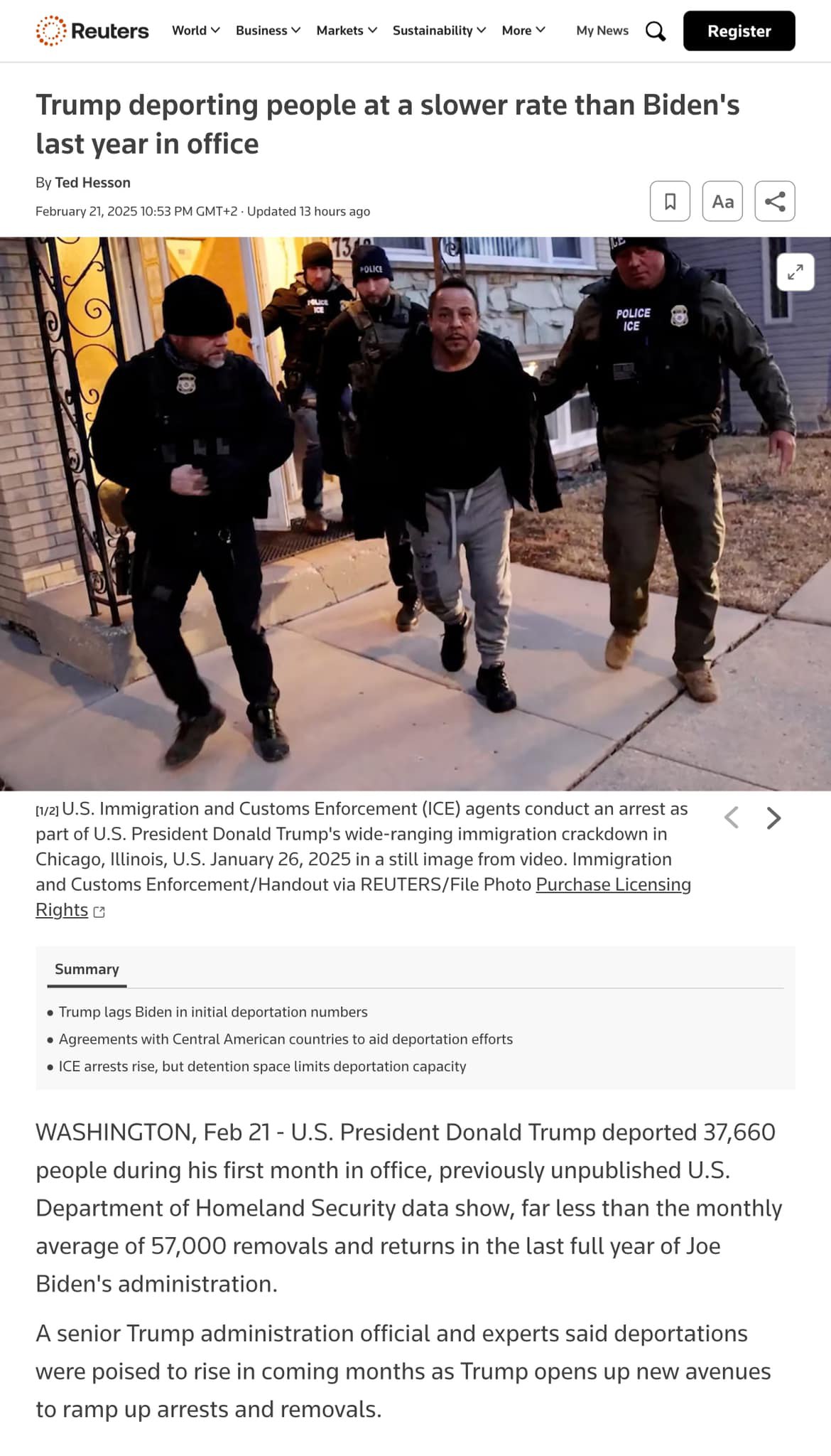Однако первоначальные данные свидетельствуют о том, что Трампу будет сложно соответствовать более высоким показателям депортации за последний полный год администрации Байдена, когда было поймано большое количество мигрантов, незаконно пересекающих границу, что упростило их депортацию.