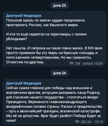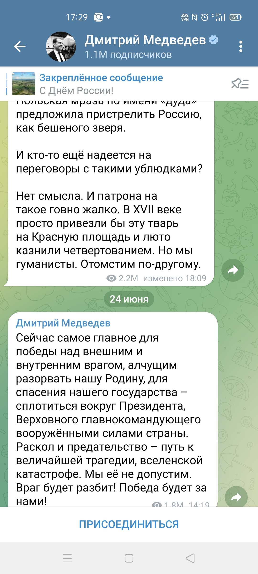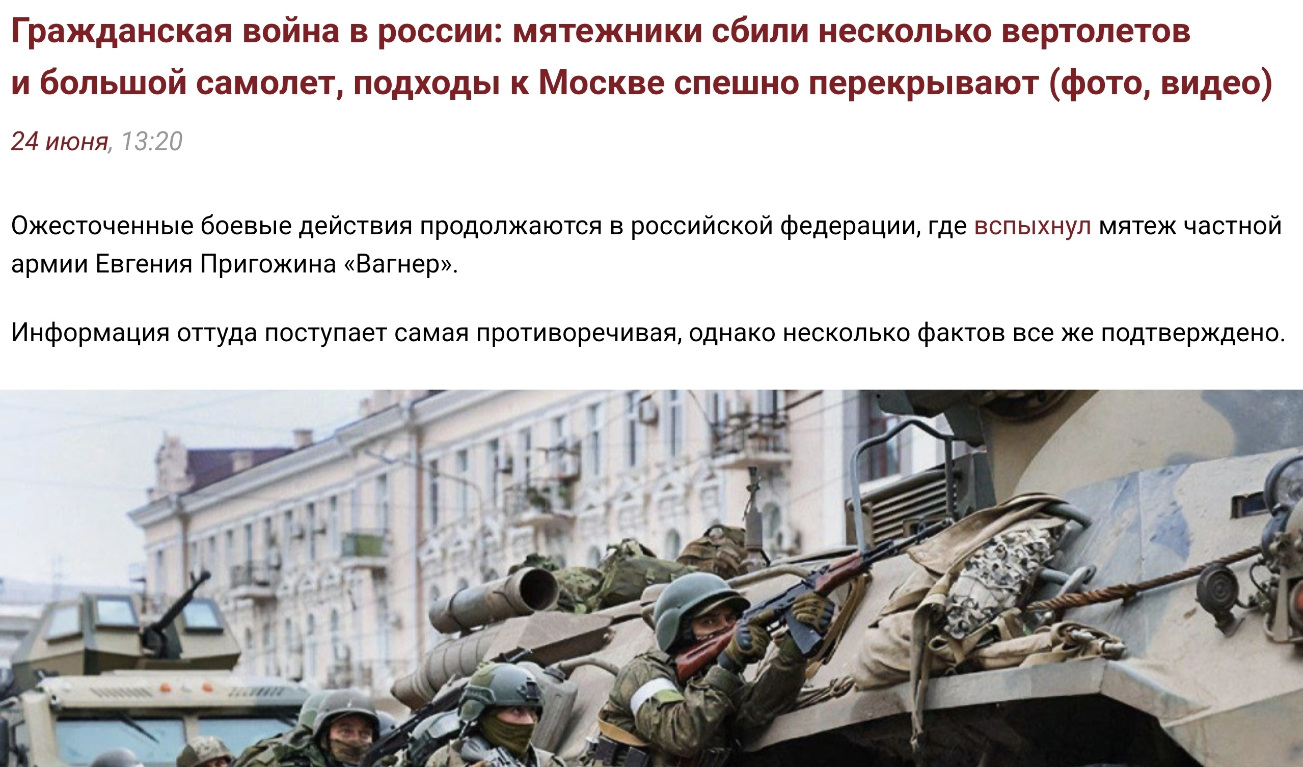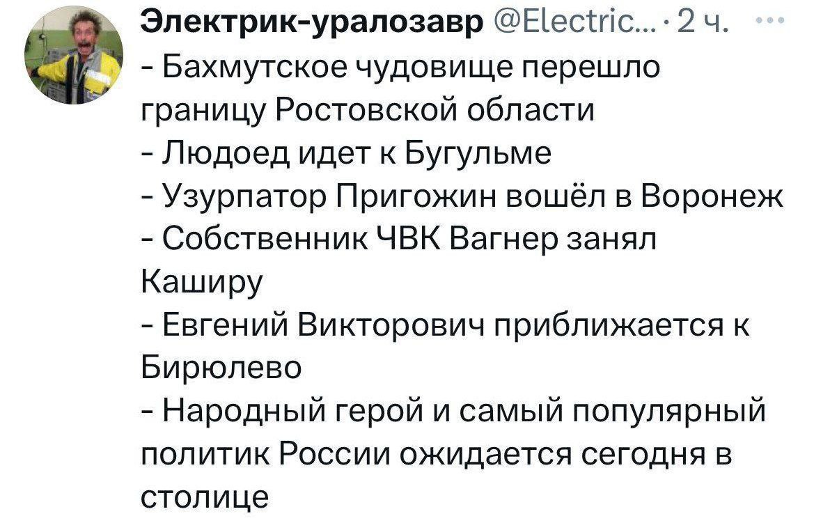 Завтра выйдет закон, что всех, кто называет Пригожина предателем, а вагнеровцев - мятежниками, будут вязать на 15 лет. А дальше посмотрят.