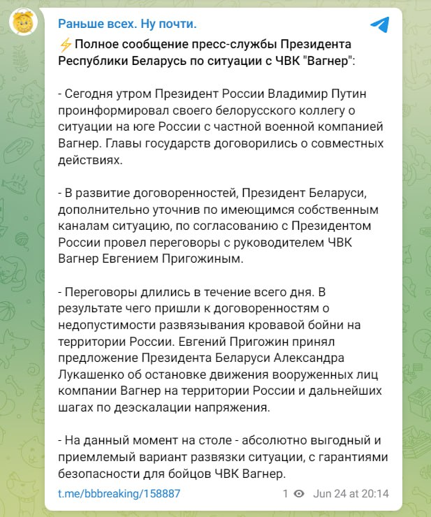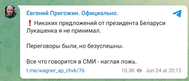 Пригожин принял предложение картофеленфюрера "об остановке движения и передислокации ЧВК Вагнер в Беларусь".