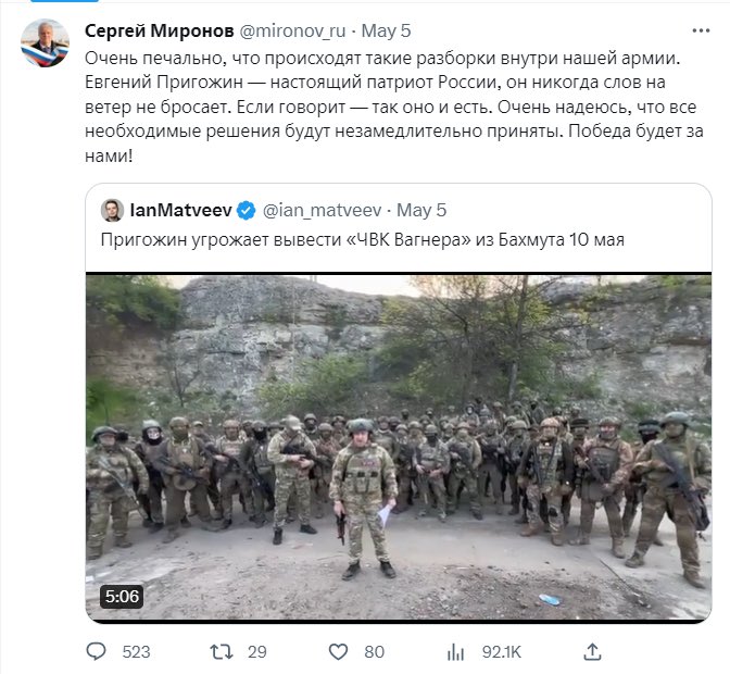 А кто-нибудь понял позицию Пригожина по поводу войны в Украине? Он же вчера заявлял, что нас МО обмануло о причинах войны, следовательно вроде как нужно прекращать войну и выводить войска. А сегодня с утра в Ростове он заявлял, что, мол, мы захватили аэродром, но не будем мешать наносить удары по украинцам. Что за шиза?
