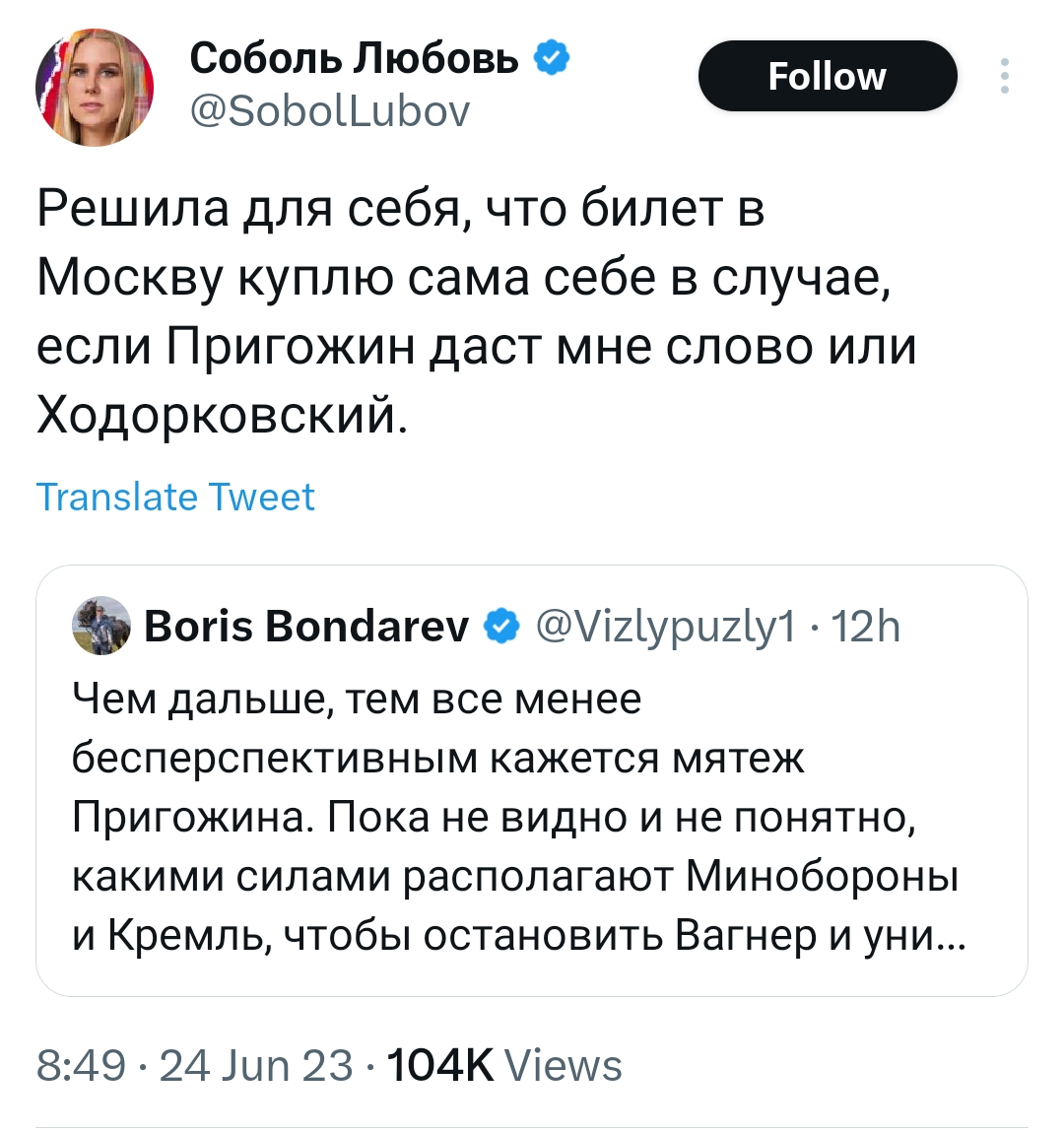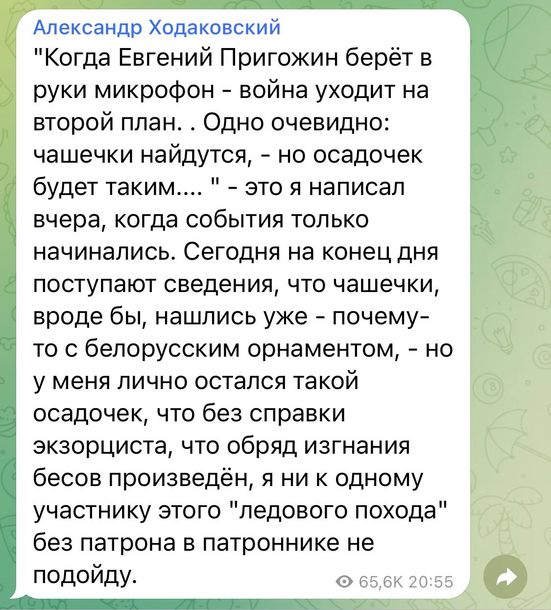 Я был уверен, что Пригожин дойдет до Москвы, потому что он зашел слишком далеко и ему нет выхода. Очень удивлен.