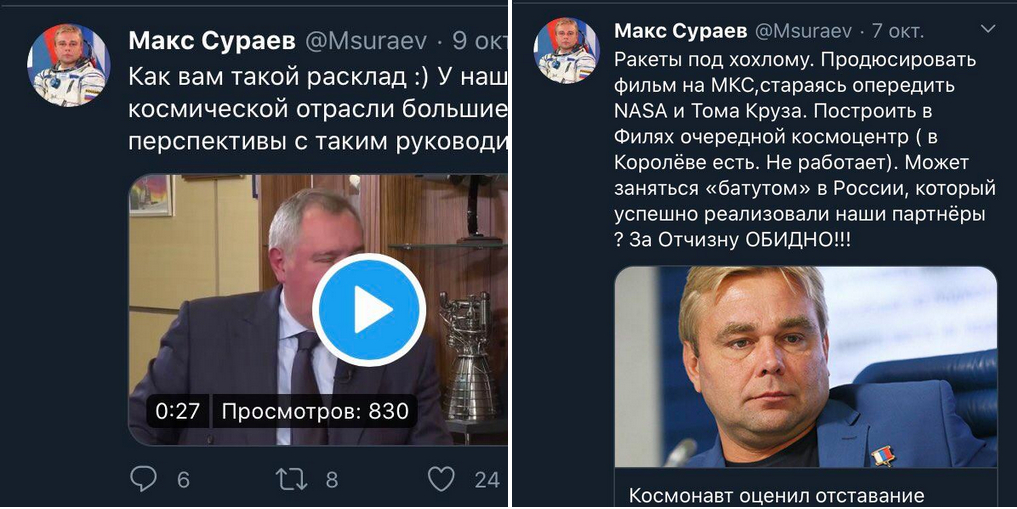 Замечу, что нынешний бардак сильно достал большинство космонавтов в отряде, но они, как люди служивые, пока сдерживаются, некоторые - из последних сил. Но как только космонавт покидает отряд, он становится более свободен в высказываниях. Можно привести пример Федора Юрчихина, 8 июня опубликовавшего свою статью в "Коммерсанте"  "Прошлым можно гордиться, но им нельзя жить". После этой критической статьи пять раз слетавший в космос Юрчихин был вынужден покинуть свою административную должность из-за давления со стороны Рогозина, но Сураев, будучи депутатом от "Единой России", решил, что его Рогозин не достанет.  Поэтому и появились его твиты, вызвавшие в руководстве Роскосмоса эффект разорвавшейся бомбы. Сначала даже прошла информация о том, что "твиттер Сураева взломали", однако Максим подтвердил своим знакомым, что это именно его посты.