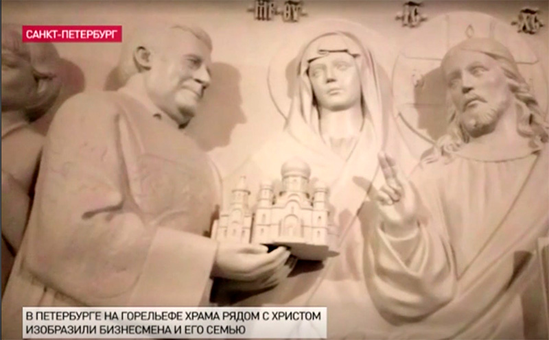 В новом петербургском храме, построенном на частные средства, посетителей изумила скульптурная композиция, где изображен генеральный спонсор. Правильнее сказать — ктитор и его семья. Строитель этот — Вячеслав Заренков — бизнесмен, миллиардер. В прошлом году, когда дарил другой храм, ограничился фреской на стене, где изображена внучка маленькая совсем и напротив — местный церковный иерарх. Теперь — деяние высечено в камне, внучка выросла, а храм Заренков дарит лично… Иисусу Христу.