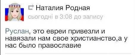 LamoNosov: А ведь, между прочим, она не тупит. Вернее так - из столь короткого сообщения нельзя понять тупит она или не тупит. Дело в том, что у сторонников всяких "альтрнативных историй" есть концепция, что православие есть одна из ветвей религии, возникшей задолго до христианства, а христианство это модификация так называемой "греческой веры", ну и всякая такая прочая фигня. Похоже она нечто подобное озвучивает.