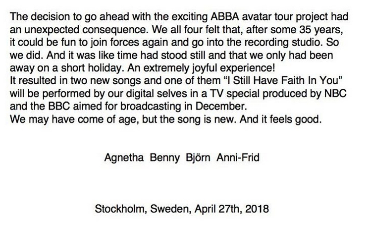 Вот это главная новость дня. Не знаю, что из этого получится, но ABBA - это нечто совершенно особенное.