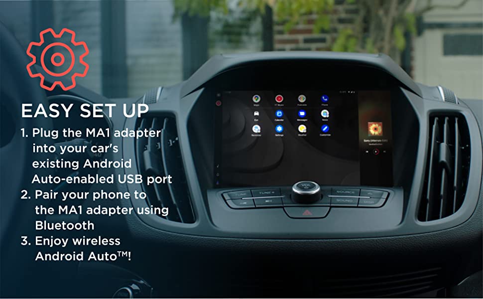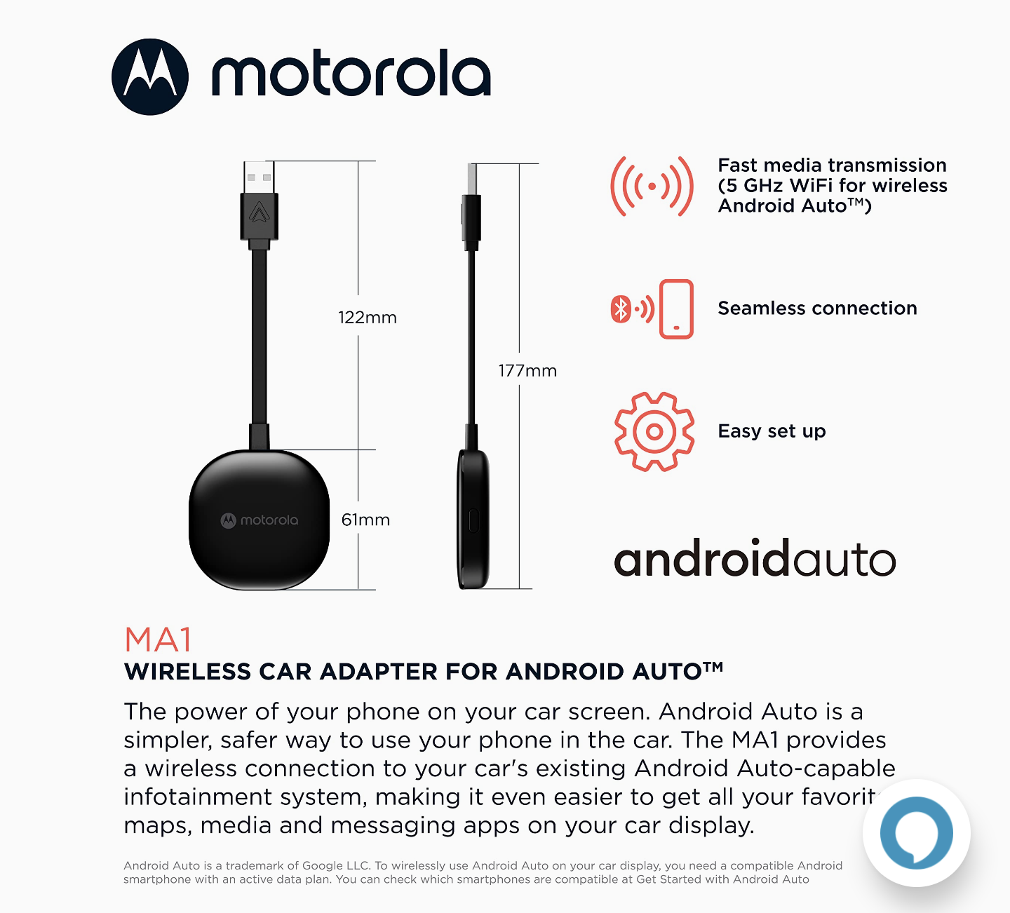 Выдержка из описания на сайте Моторолы: "The MA1 provides a wireless connection to your car's existing Android Auto-capable infotainment system"