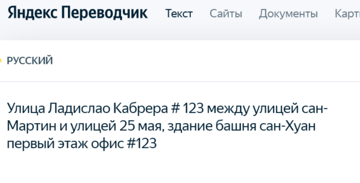Calle Ladislao Cabrera # 123 entre calle san martin y calle 25 de mayo, edificio la torre san juan primer piso oficina #123. Циферки поменял, на всякий случай. Гугл транслейт не справился с переводом, кстати.