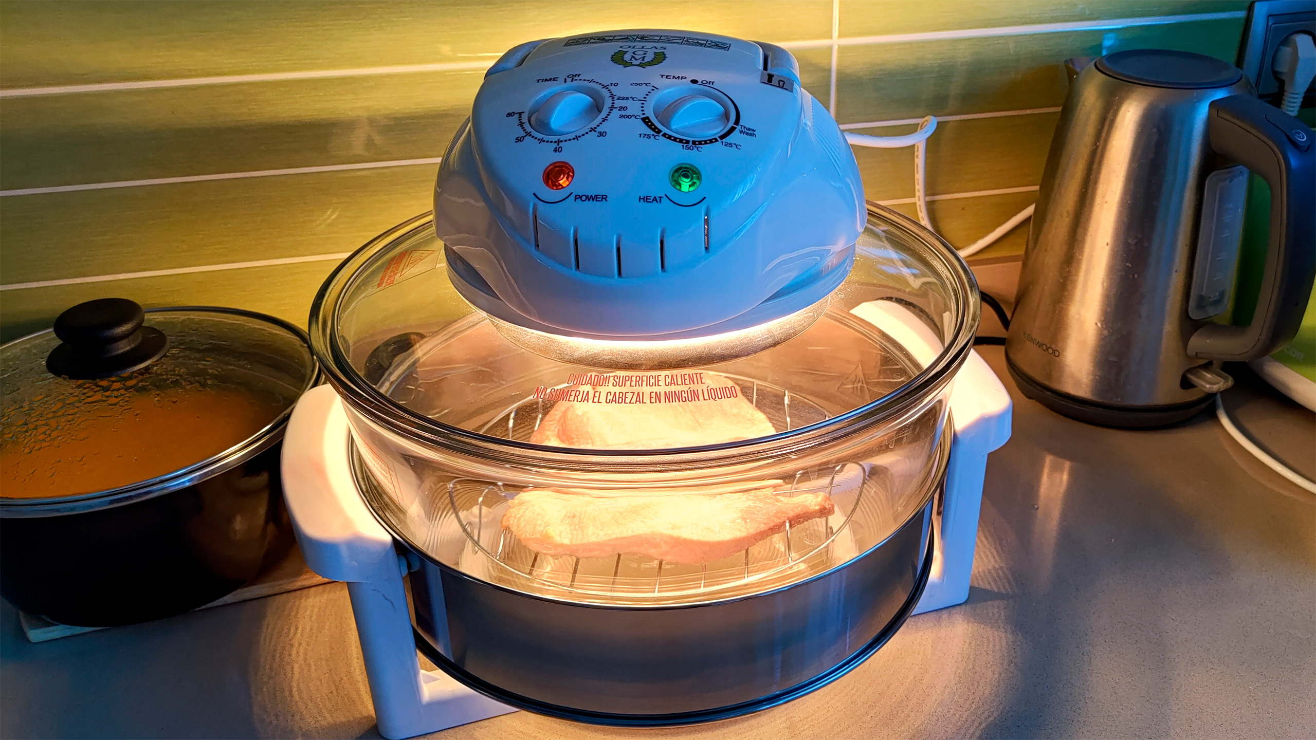 Несколько дней в нем готовлю - пока все нравится. Да, он заметно больше гриля с корзиной, но зато тут нет никаких проблем с емкостью (в некоторые аэрогрили с корзиной даже две куриные ножки одновременно не засунешь, а сюда запросто помещается целая курица), хорошо виден процесс приготовления, что важно, нет никаких проблем с покрытием чаши (что там этому стеклу сделается?), ну и мыть после готовки стеклянную чашу заметно удобнее, чем корзину и емкость, куда она вставляется (в емкость сливается жир).