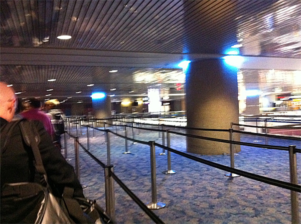 Я прошлый раз в Вегасе я ухитрился опоздать на рейс, приехав практически за три часа - там на секьюрити была огромная толпа, и мы пролетели. В смысле, не улетели.