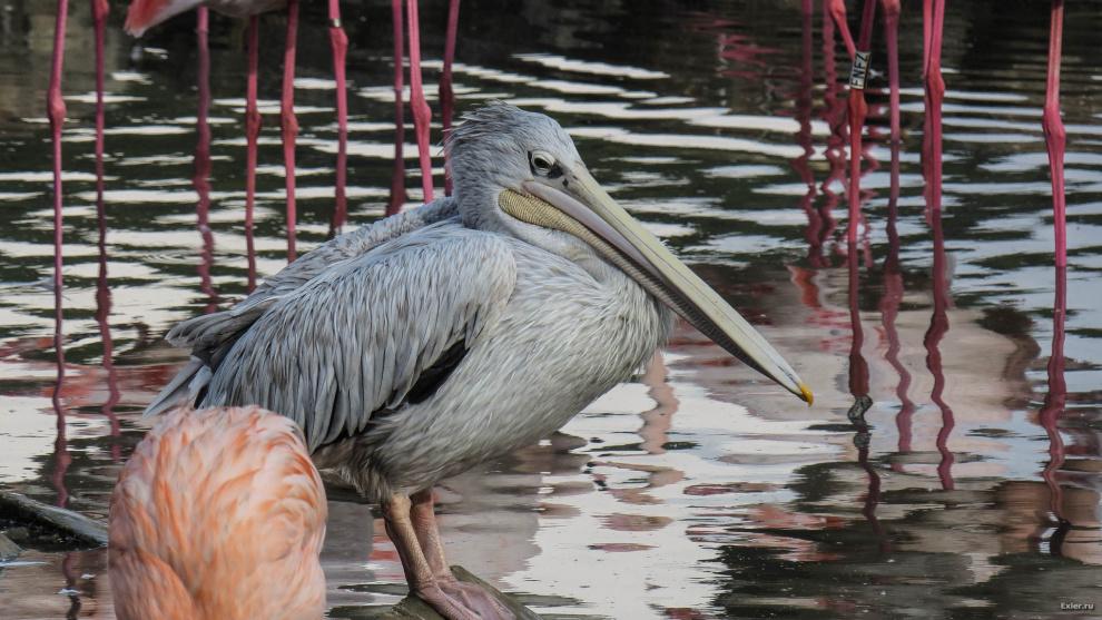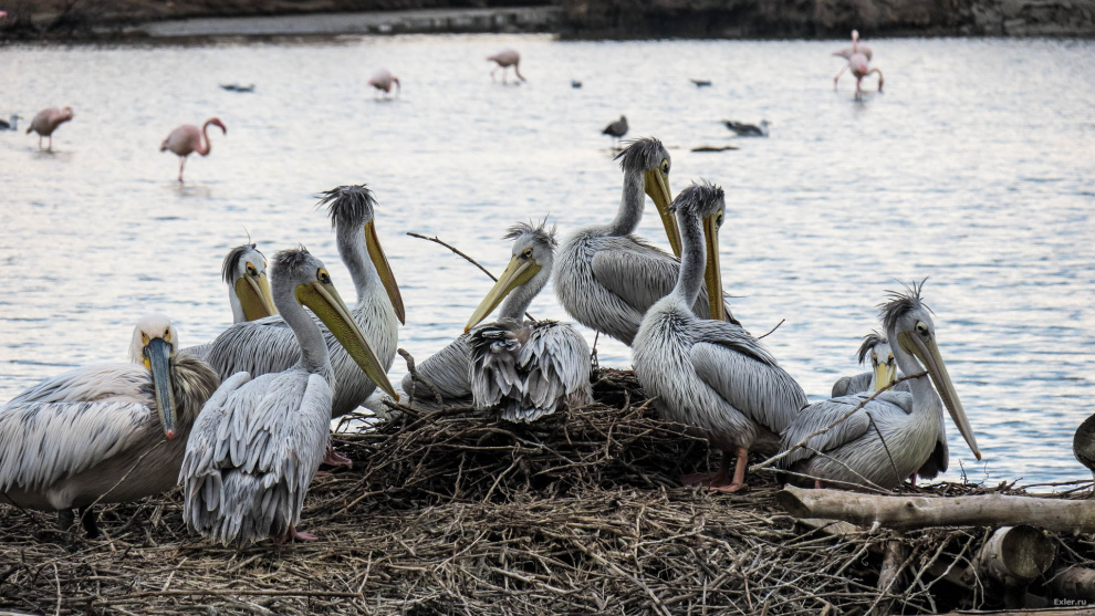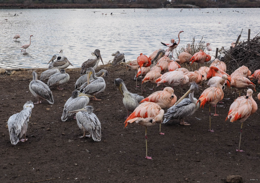 По пути обратно услышали огромное оживление среди фламинго. Оказывается, приехал служитель их подкормить. Я подошел посмотреть - кормили их тушками маленьких цыплят. Ребенку это дело не стал показывать.