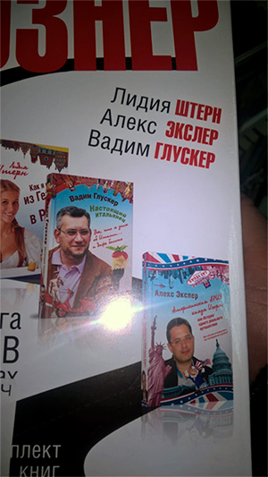 Юрий прислал фотографию из книжного на Сухаревке. Стоит такой здоровый плакат и там здоровая надпись ПОЗНЕР. И под ним помельче - Штерн, Экслер, Глускер. Прям айсберги, вайсберги, всякие там рабиновичи.