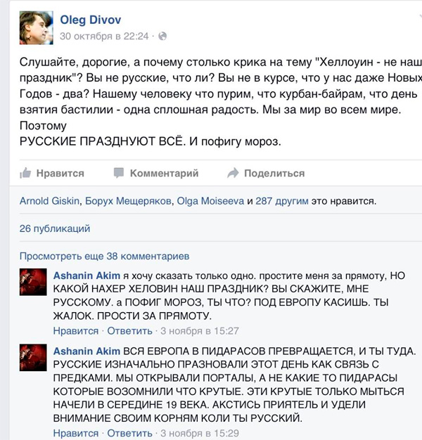 Не говоря уже о том, что как типичный тролль, текст не читал. Смысла не понял - а смысл высказывания "Все что праздник - все нам в радость". А далее - всякая фигня про предков, с которыми порталы связи именно в самайн/двс/хелоуин открывались.