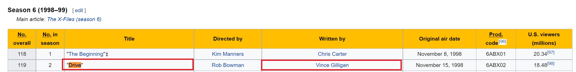 Притом что в свое время и Брайан Крэнстон, и Аарон Пол, и Дин Норрис, и Реймонд Круз засветились в "Секретных материалах". Как, собственно, и создатель "Во все тяжкие" Винс Джиллиган.