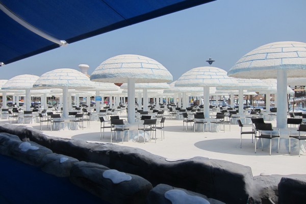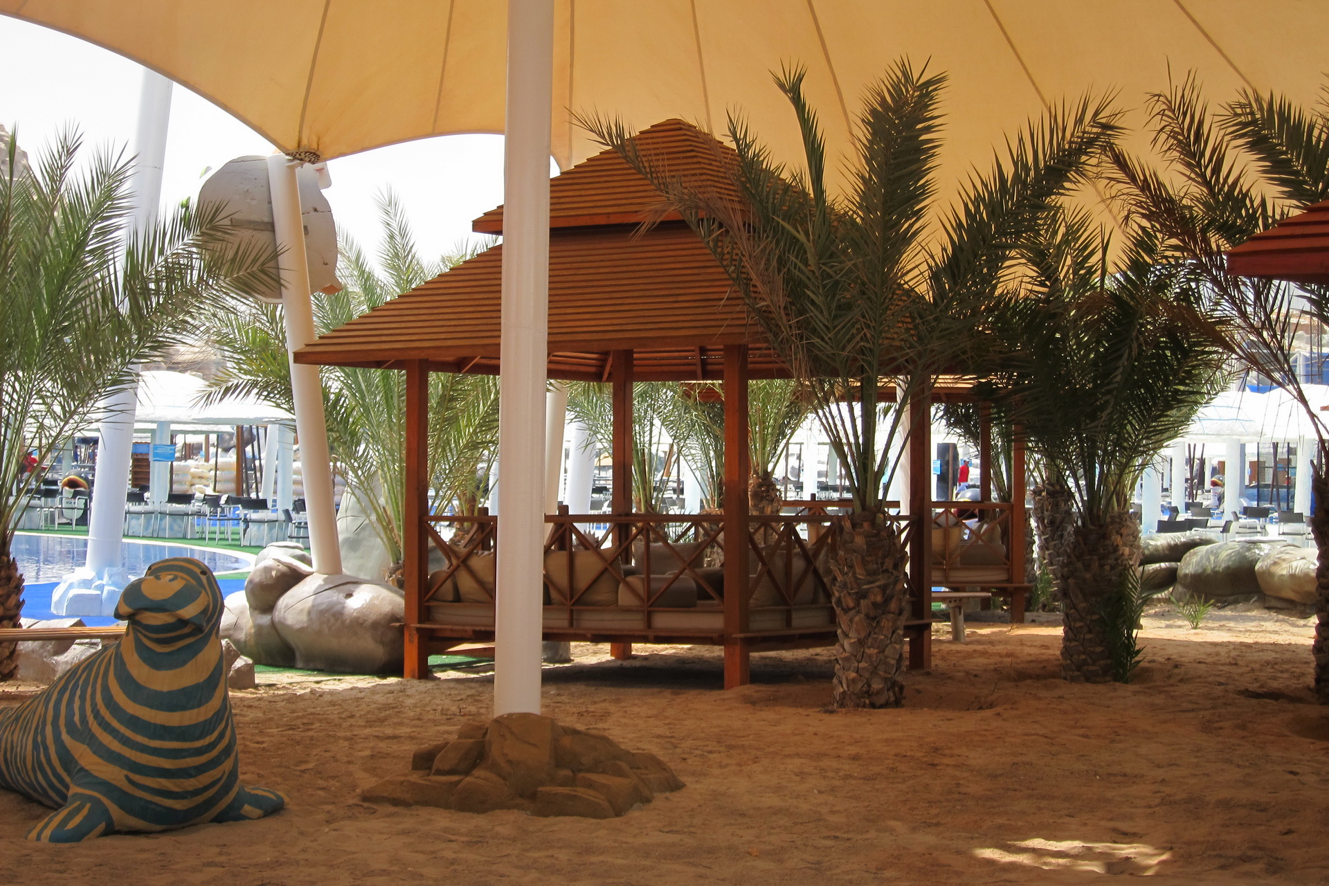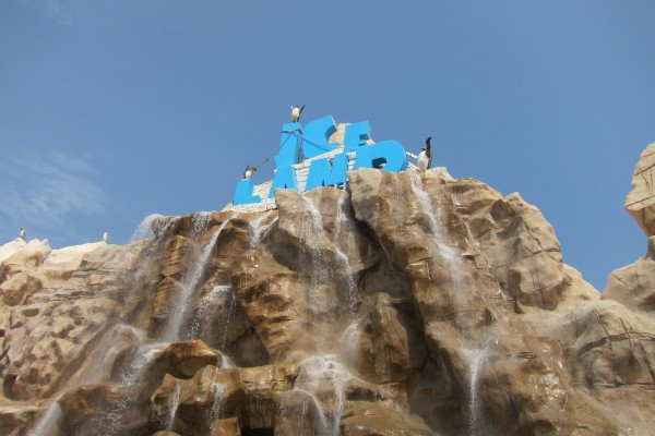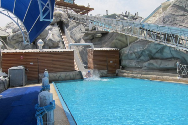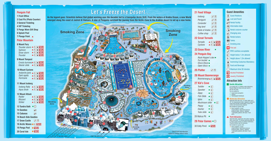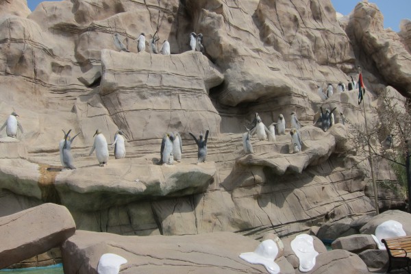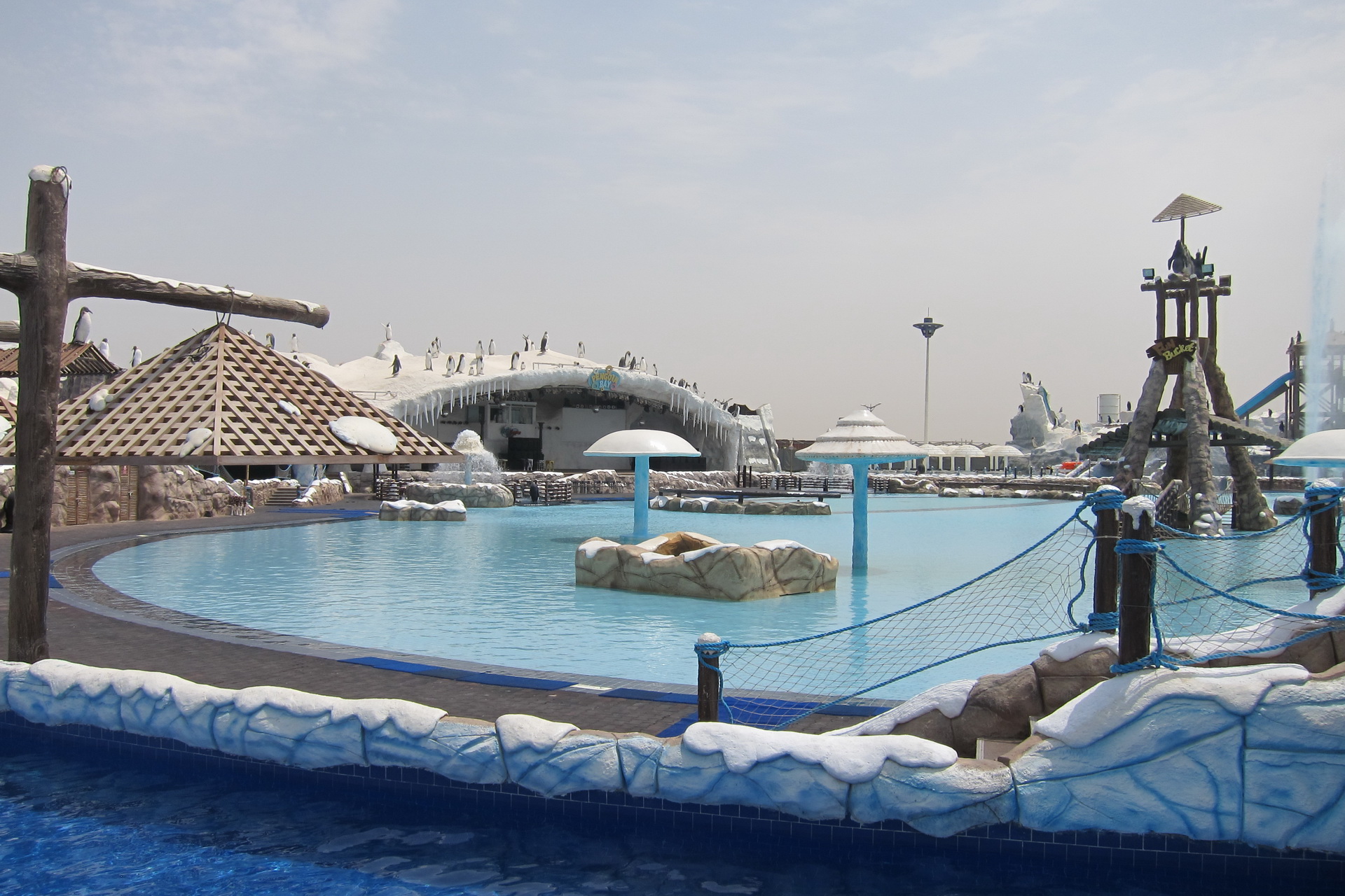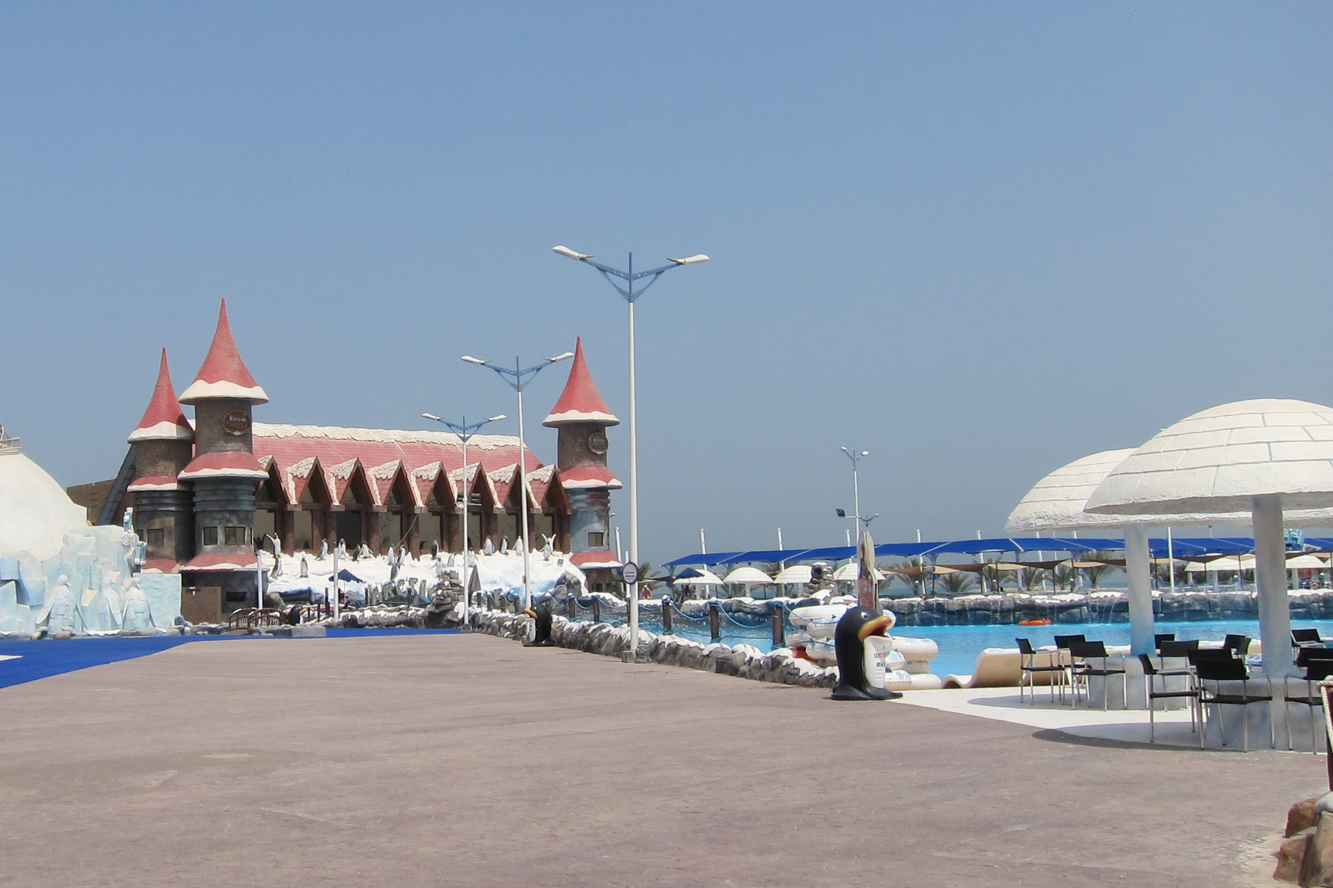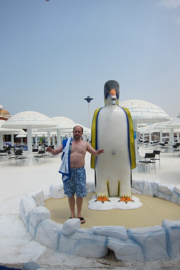 Идея аквапарка довольно забавная - "Заморозим пустыню". Поэтому внутри вокруг всякие "снега" и бесконечное количество совершенно психоделических пингвинов.