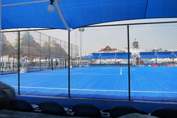 Здоровенное футбольное поле, снабженное специальными установками для искусственного дождя - чтобы играть было комфортно.