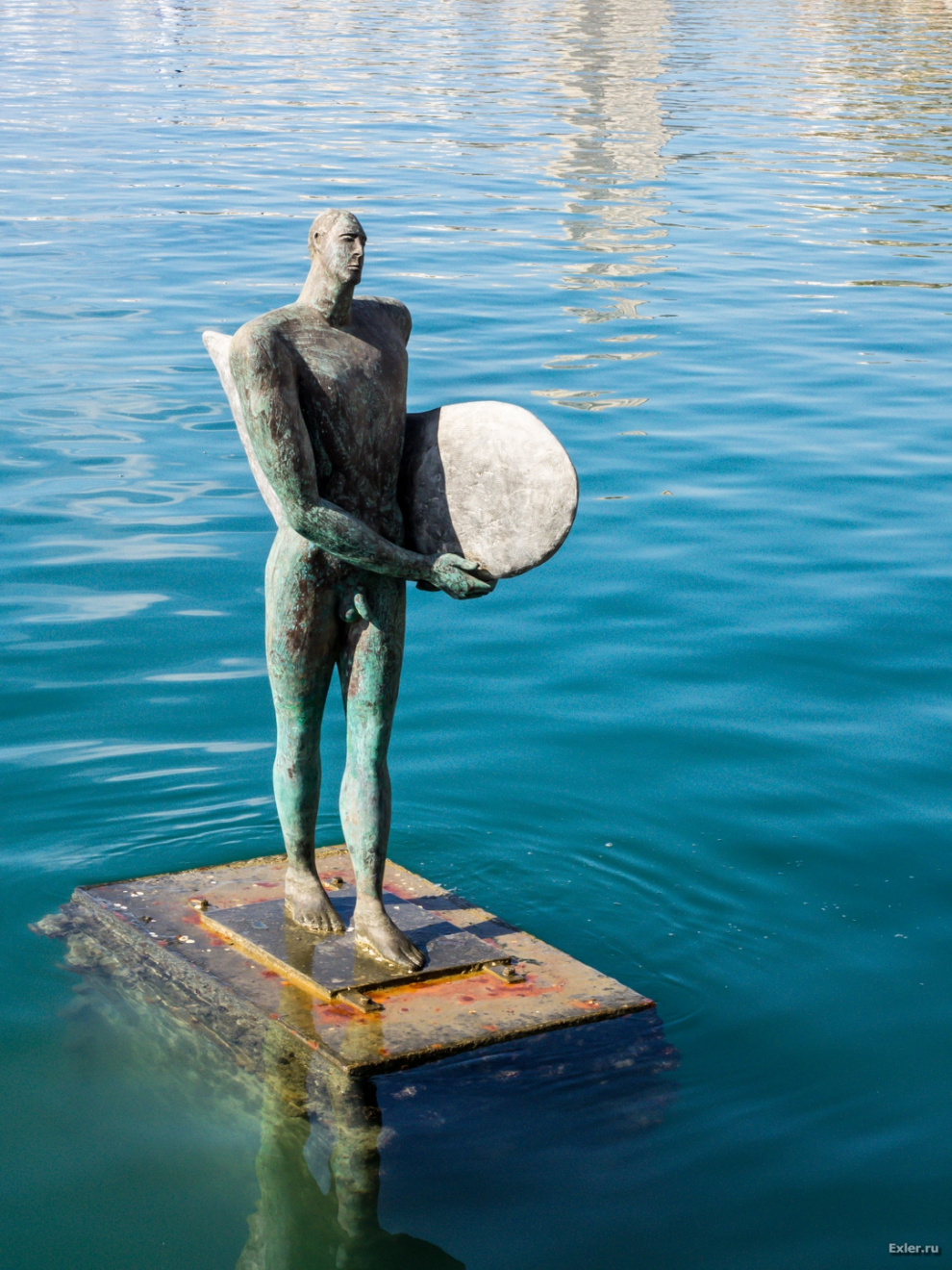 Любопытная скульптура "Ограбленный серфингист (сняли последние трусы) грустно бредет на берег по морю аки по суху".