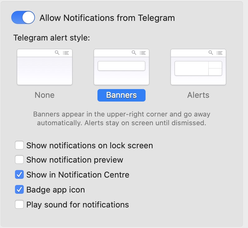 В вашем случае я выбрал бы "None" в секции "Telegram alert style".