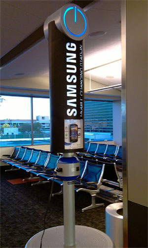 В американских аэропортах сделали очень удобную штуку: Samsung в гейтах на посадку поставил вот такие зарядные столбики. Там пять зарядок, к которым можно подключать ноутбук, айфон, айпад и так далее. Я на рейс приехал аж за три часа (лечу обратно в Москву), теперь можно спокойно лазить по Интернету и не волноваться, что заряда батарей ноутбука и айпада не хватит до Москвы.