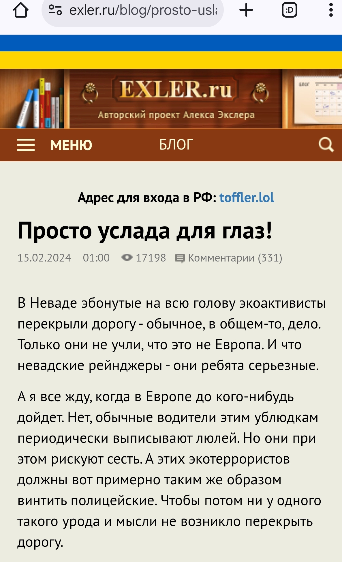 Но интересно, какой процент завсегдатаев блога поддерживает этих экотеррористов, которые сами не делают ничего для охраны или очистки, защиты и сохранения среды обитания, а только портят что-то привычное и полезное, от транспортных потоков до произведений искусства?