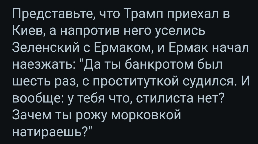 Трамп как прагматик оценивает ситуацию с точки зрения выгод и слабостей сторон. Его заявление – не попытка обвинить, а констатация факта: Украина уязвима, поскольку зависит от западной помощи. Если бы он действительно считал, что Украина сама виновата, он бы отказался от помощи. Здесь речь идёт о реальной оценке политической ситуации, а не об эмоциональном «абьюзе».