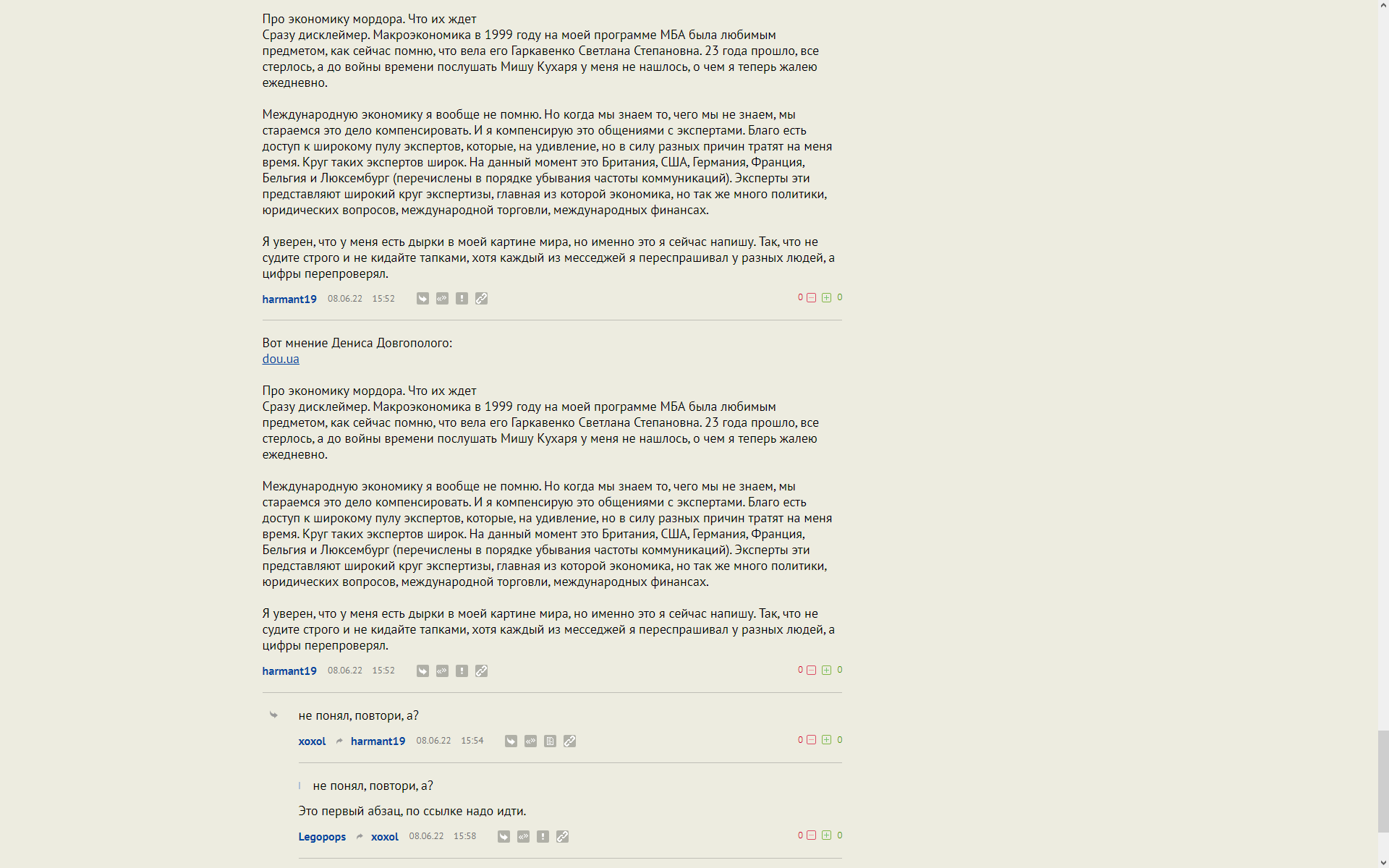 Дальше не стану продолжать. Это поколение 30-40 лет так видит обстановку. Нет связи с миром и ничего, проживем как-нибудь. Так что Мовчан прав, к моему великому сожалению.