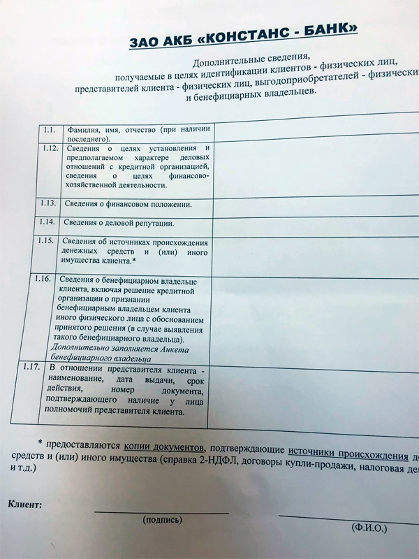 На самом деле кроме паспорта ничего не требуется. Ну, по крайней мере в нашем банке. И все эти "сведения о финансовом положении" и "источниках происхождения денежных средств" заполняются со слов клиента на уровне соцопроса "Хорошее фин.положение", "среднее фин.положение", а источники средств - "личные накопления". "зарплата" и т.п. Говорите, что хотите, никто не проверяет.