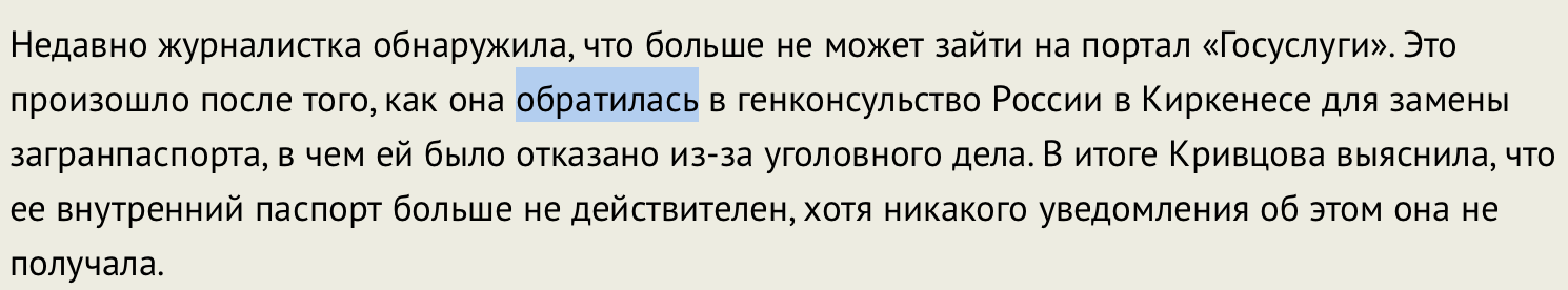 Недавно журналистка обнаружила, что больше не может зайти на портал «Госуслуги». Это произошло после того, как она обратилась в генконсульство России в Киркенесе для замены загранпаспорта, в чем ей было отказано из-за уголовного дела. В итоге Кривцова выяснила, что ее внутренний паспорт больше не действителен, хотя никакого уведомления об этом она не получала.